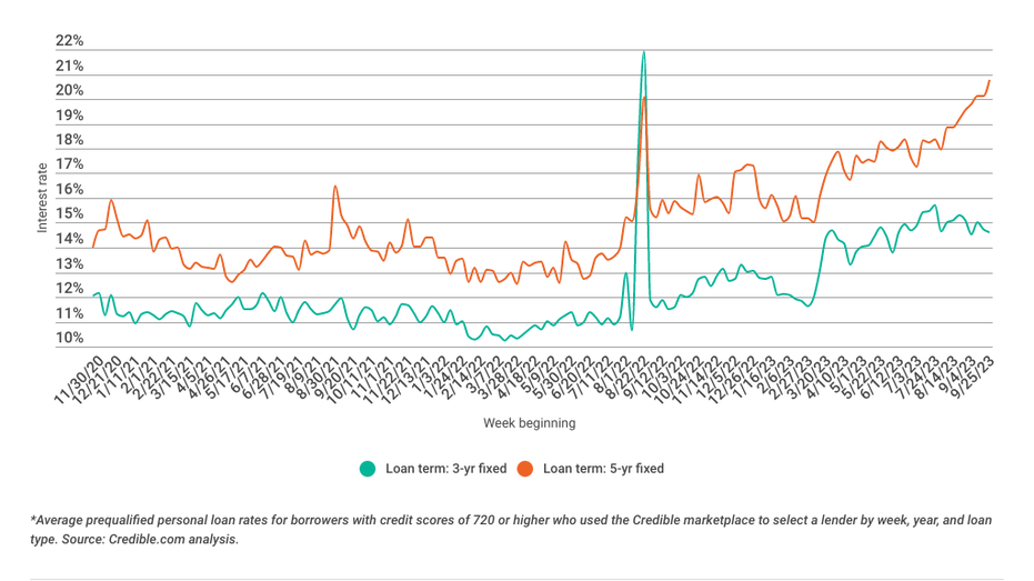 Personal loan interest rates spiked over the last seven days for 3- and 5-year loans. 3-year loans increased by 0.89 percentage points. Meanwhile, 5-year loans rose by 0.75 percentage points. Interest rates for both loan terms remain significantly higher than they were this time last year. Still, borrowers can take advantage of interest savings with a 3- or 5-year personal loan right now. Both loan terms offer interest rates that are much lower than higher-cost borrowing options such as credit cards.