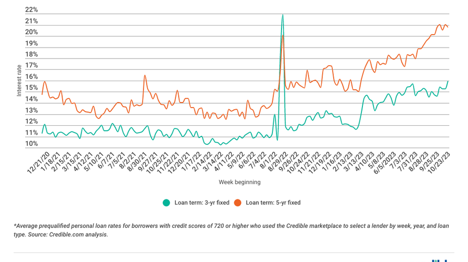 Personal loan interest rates rose over the last seven days for 3-year loans and lowered for 5-year loans. Three-year loans rose by 0.38 percentage points. Meanwhile, 5-year loans fell by 1.37 percentage points. Interest rates for both loan terms remain significantly higher than they were this time last year. Still, borrowers can take advantage of interest savings with a 3- or 5-year personal loan right now. Both loan terms offer interest rates that are much lower than higher-cost borrowing options such as credit cards.